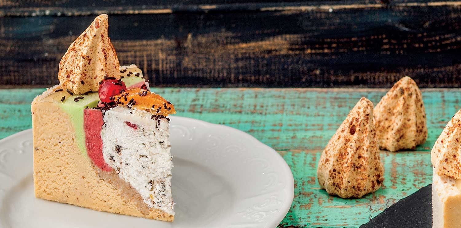 Moka, pistache, fraise, pain de Savoie, chantilly aux fruits confits