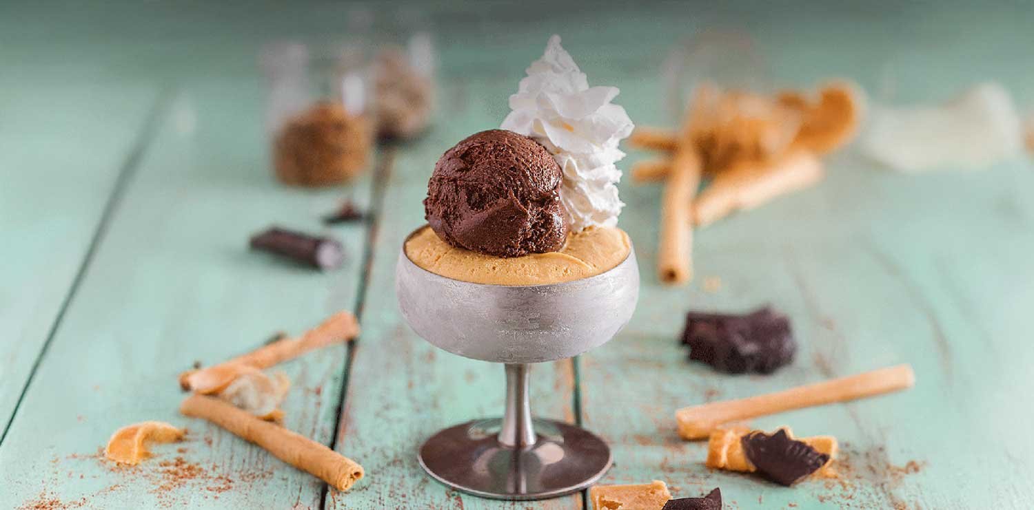 Vanille, praliné, chocolat, pistache, fraise ou pêche de saison avec chantilly